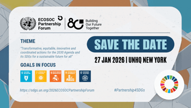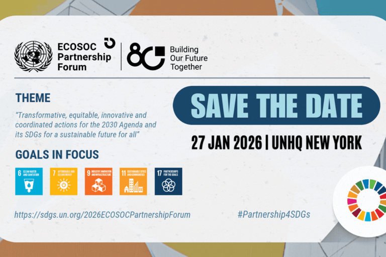 The 2026 Partnership Forum of the Economic and Social Council (ECOSOC) will take place on 27 January 2026 at the UN Headquarters in New York under the theme “Transformative, equitable, innovative and coordinated actions for the 2030 Agenda and its SDGs for a sustainable future for all”.